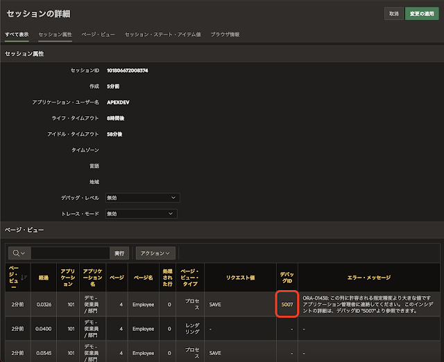 デバッグ・レベルを情報まであげると、ページ・アイテムに設定された値などもログに含まれるようになります。(ちなみにトレース・モードはSQLトレースをファイルに出力するためのオプションで、alter session set sql_trace = trueと同じです。データベース管理者の協力がなければ、ほぼ使うことのない指定です。)