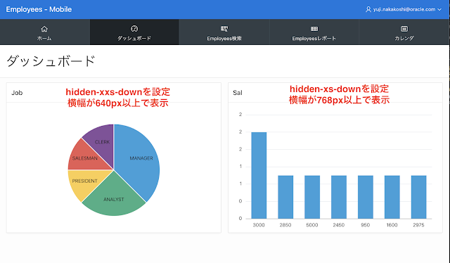 ダッシュボードを例にとります。Jobのチャートにhidden-xxs-downを設定し、横幅が640px以上であれば表示させます。Salのチャートにhidden-xm-downを設定し、横幅が768px以上であれば表示させます。