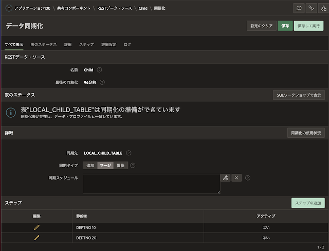 RESTデータ・ソースChildについても同様に、同期スケジュールが設定されていたら削除します。ステップの定義も不要なのですが、これはアプリケーションをエクスポートしたときの設定サンプルとするため、残しておきます。記事を読んでいる方は削除して構いません。