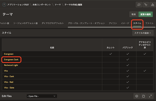 テーマ・スタイルEvergreen Darkの出力CSSファイルURLをクリップボードにコピーします。取消をクリックして、テーマ・スタイルを閉じます。