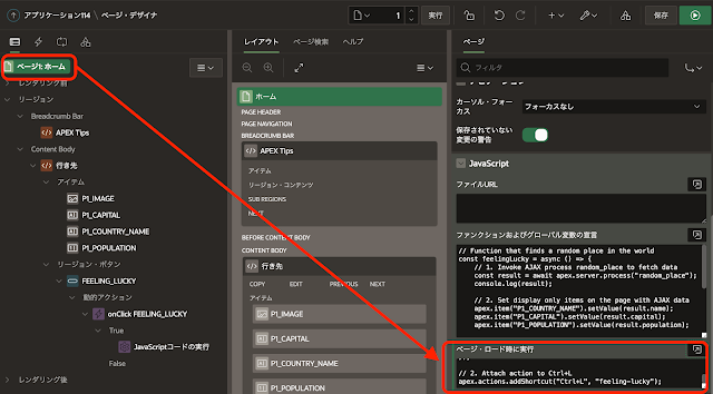 Ajaxコールバックrandom_placeを呼び出し、取得した情報をページ・アイテムに反映させる処理は、動的アクションに直接記述せずページのプロパティに記述します。