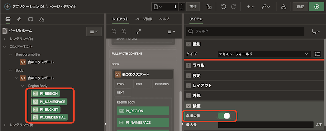 すべてに値が設定されていないとオブジェクト・ストレージの操作ができないため、作成した4つのページ・アイテムを選択し、検証の必須の値をONにします。