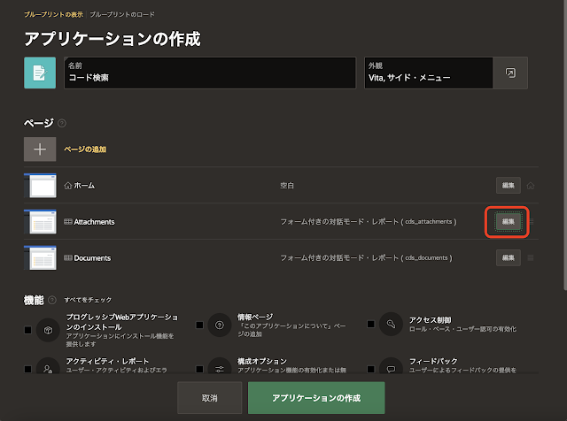 AttachmentsとDocumentsの双方を管理ページに変更し、アプリケーションの作成を実行します。