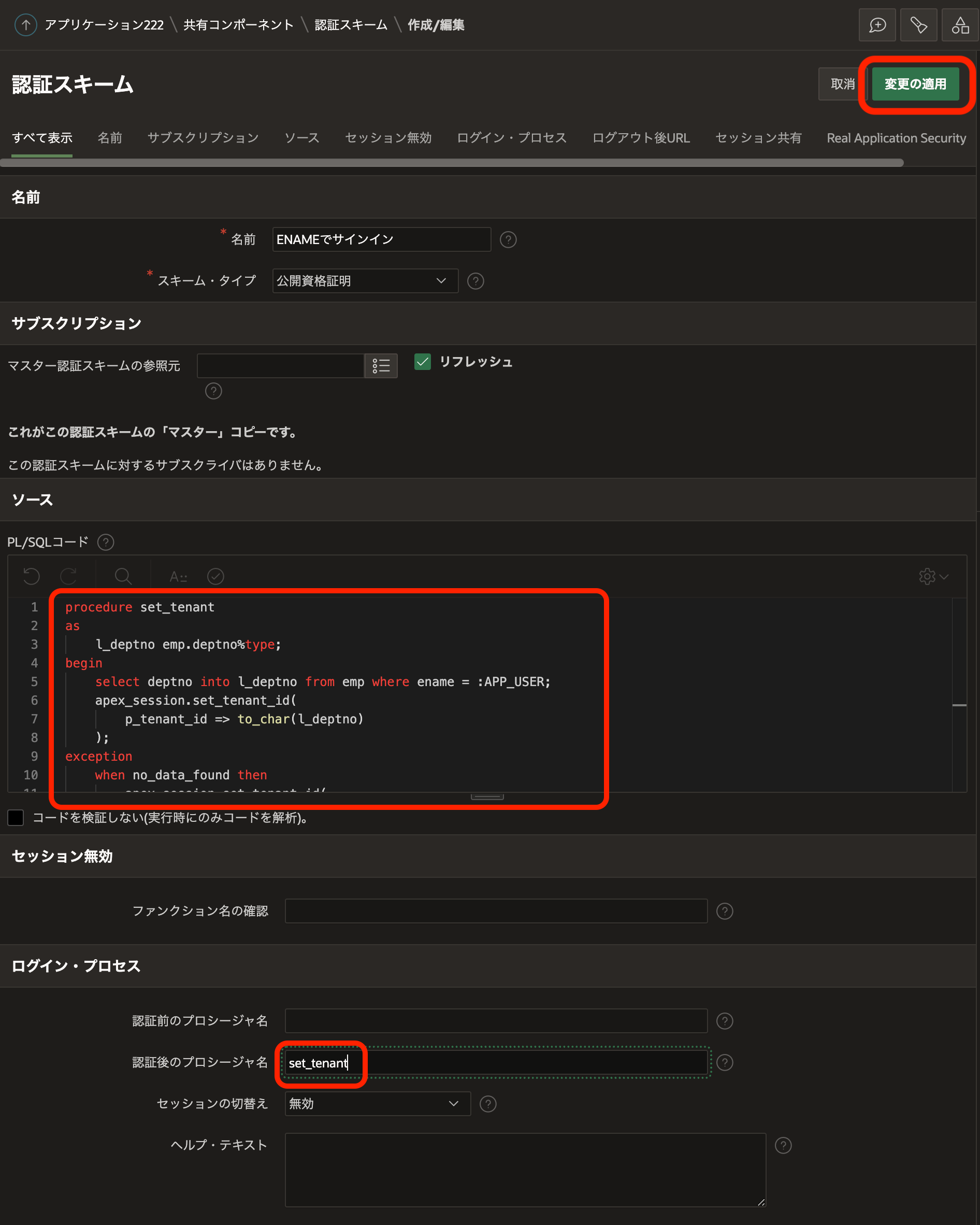 表EMPの列ENAMEの値でサインインする認証スキームを作成します。その認証スキームの認証後のプロシージャよりAPEX_SESSION.SET_TENANT_IDを呼び出し、APP_TENANT_IDを設定します。