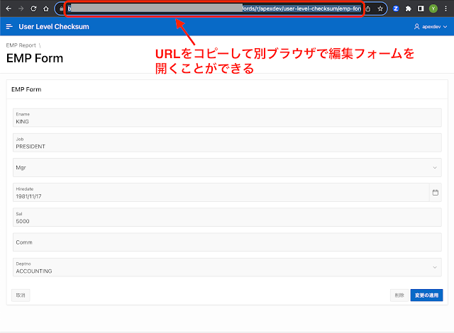例えばこのURLを電子メールに含めて送信しても、電子メールでURLを受け取った人は編集フォームを開くことができません。ページemp-formをAPEXセッション外から開けないように保護されている(ディープ・リンクが無効になっている)ことと、ページ・アイテムP3_EMPNOを保護するために生成されているチェックサムが、同じAPEXセッション内にあるときに限り有効(セッション・ステート保護がチェックサムが必要 - セッション・レベル)であるためです。