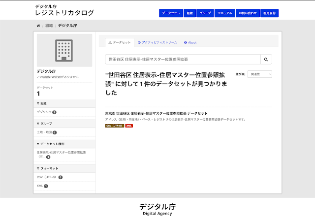 1. デジタル庁が提供しているレジストリカタログより、インポートするデータセットを見つけてダウンロードします。