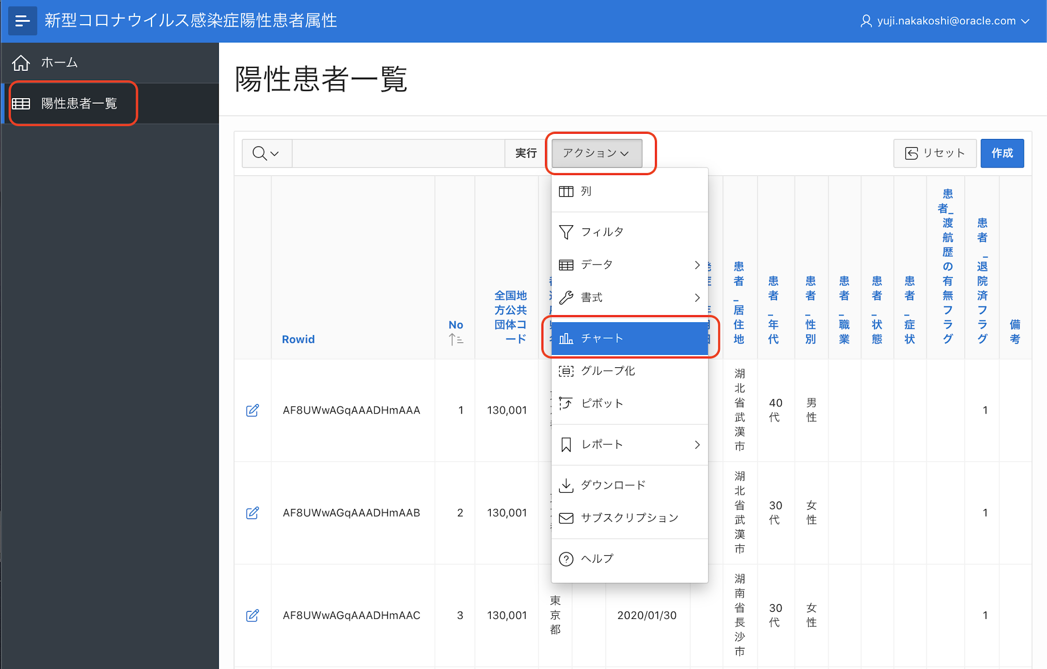 作成済みのアプリケーション、新型コロナウイルス感染症陽性患者属性を実行し、取り込まれたデータを確認します。陽性患者一覧のレポートを表示します。チャートを表示するため、アクション・メニューからチャートを実行します。