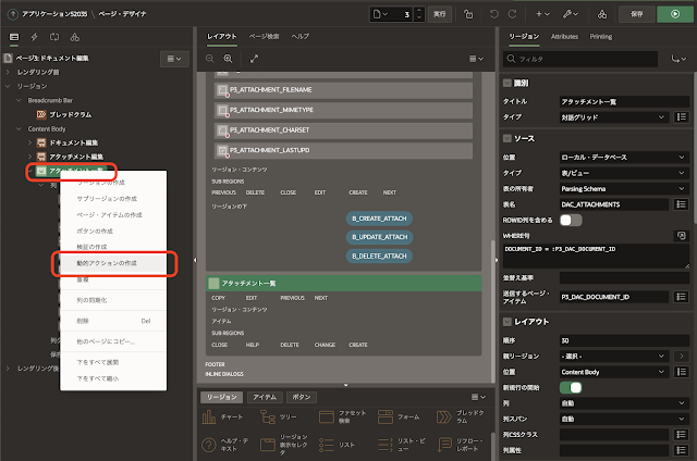 CREATE, SAVE, DELETEのボタンはドキュメントの操作を行うボタンで、B_CREATE_ATTACHはアタッチメントの追加ですが、P3_DAC_DOCUMENT_IDすなわち親のレコードが存在しないときだけは、親表であるDAC_DOCUMENTSへの行の挿入を行う、という条件です。