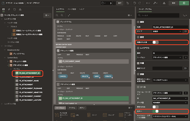 ページ・アイテムP3_DAC_ATTACHMENT_IDを選択します。こちらは主キーであり、利用者が入力することがないため、タイプを非表示にします。また、動的アクションによって設定するため、保護された値をOFFにします。また、主キーについてはONにします。