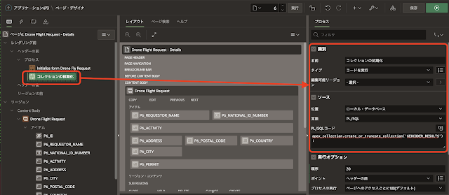 レンダリング前でプロセスの作成を行います。名前をコレクションの初期化とし、タイプとしてコードを実行を選択します。ソースの位置はローカル・データベース、言語はPL/SQL、PL/SQLコードに上記のAPEX_COLLECTIONの呼び出しを記述します。