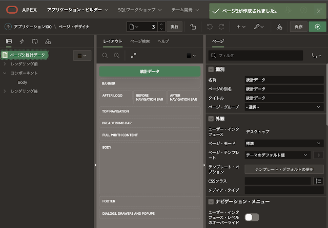 ページ作成ウィザードを起動し、名前を統計データとした空白ページを作成します。ページが作成されると以下の画面になります。ページ番号は3を想定しています。