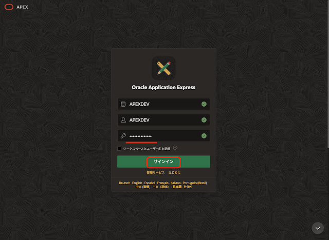 コンパートメントはルート、表示名はAPEXDEV、データベース名もAPEXDEVとしています。表示名やデータベース名は作業に合わせて変更して構いませんが、この後に出てくるAPEXDEVという文字列は、変更した名前に書き直す必要があります。ワークロード・タイプの選択としてデータ・ウェアハウスもしくはトランザクション処理のどちらかを選択できます。JSONおよびAPEXではOracle RDF Graph Serverを使うことはできません。今回はトランザクション処理を選んでいます。Always Free枠を使用するため、デプロイメント・タイプの選択は共有インフラストラクチャになります。