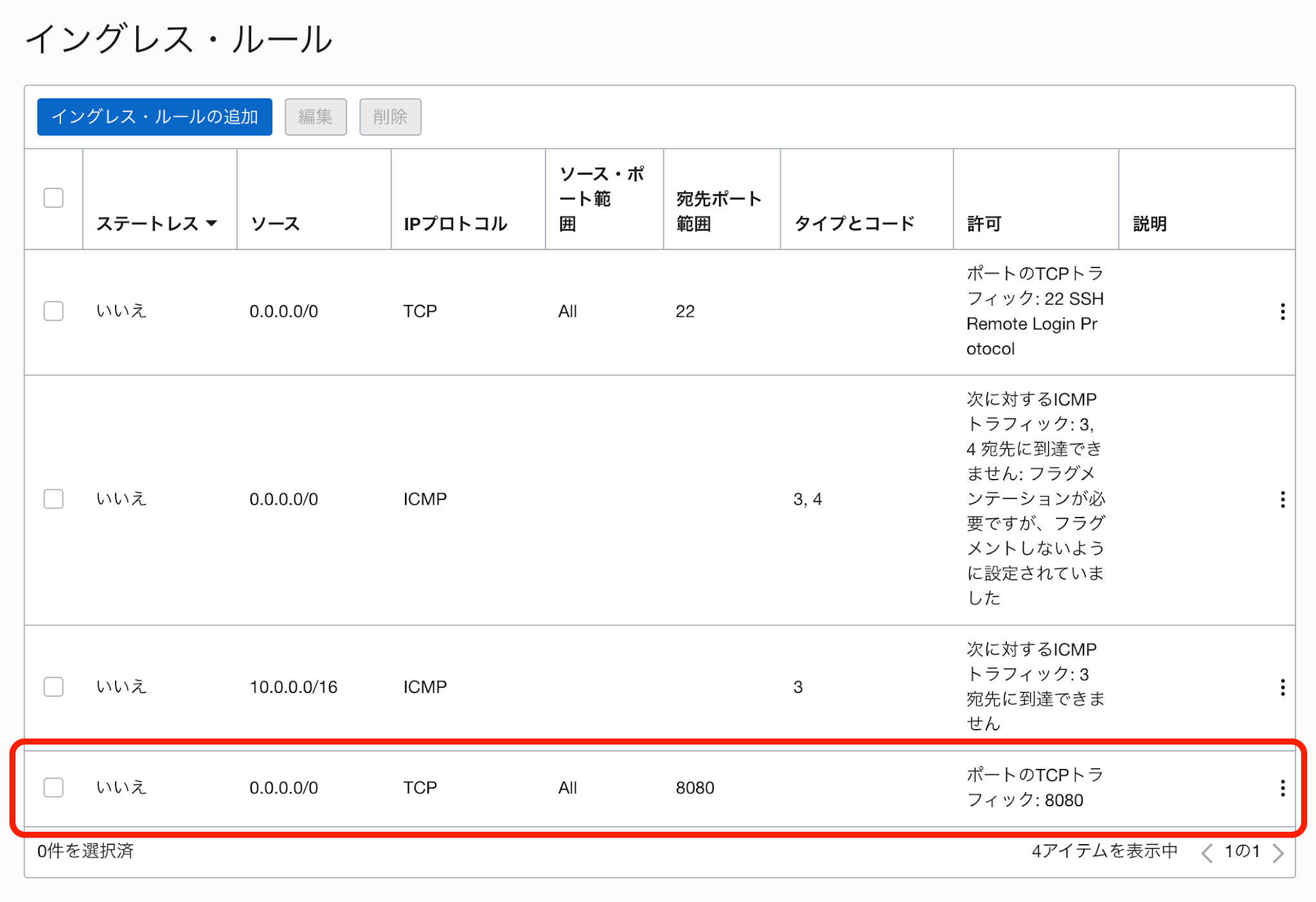 次にネットワークの設定として、8080番を宛先とした通信を許可します。