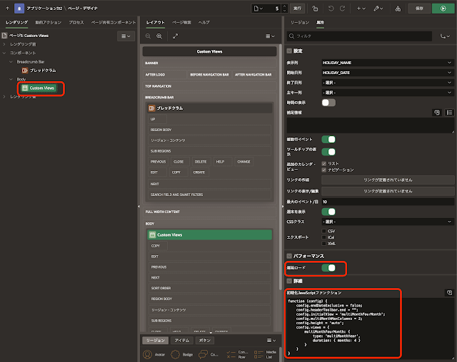 これらの新設されたビューは、Oracle APEXのページ・デザイナでは宣言的には扱えないため、初期化JavaScriptファンクションで定義します。